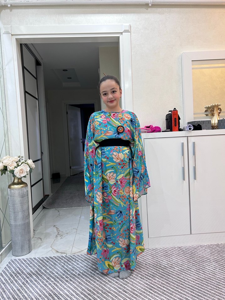 Renkli bohem tarzda, uzun kollu ve straplez yaka, dökümlü tasarıma sahip sentetik kumaştan yapılmış bol kesim uzun elbise.