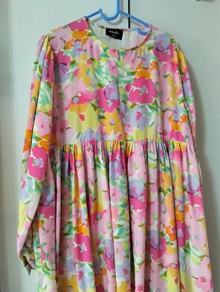 Yumuşak sentetik kumaştan, bol kesim, uzun kollu, yuvarlak yakalı, pastel tonlarda batik desenli, fırfır detaylı uzun bohem elbise.