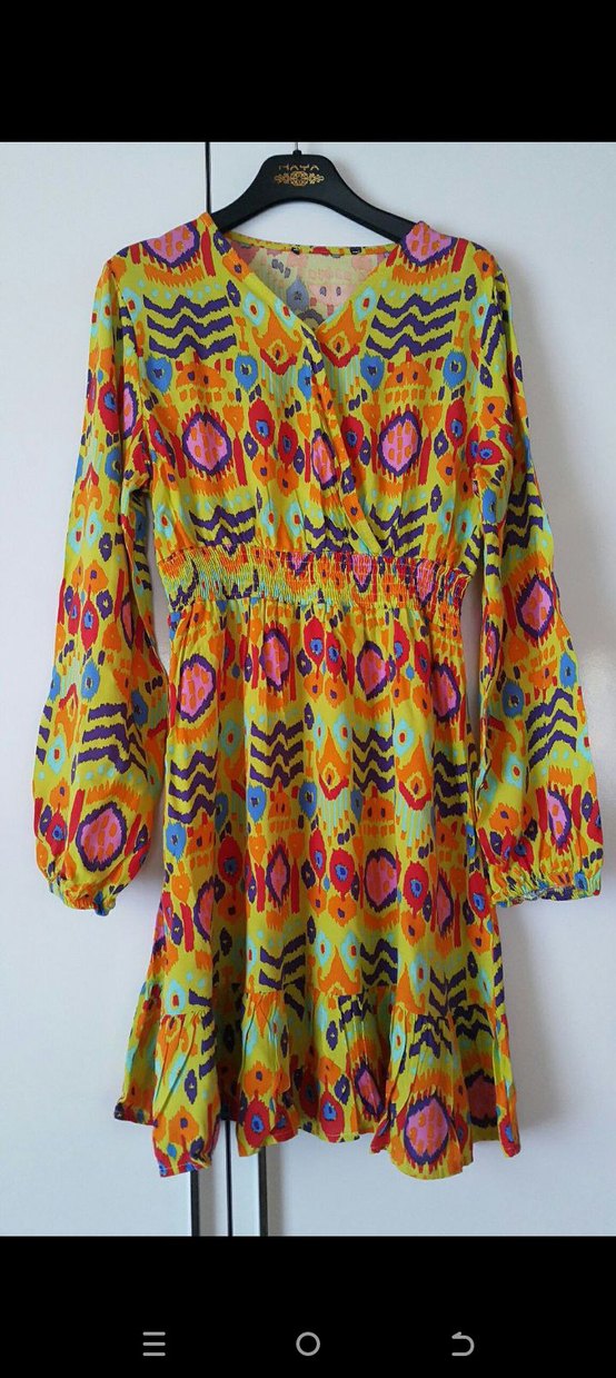 Renkli bohem tarzda, uzun kollu ve v yaka, bol kesim kısa elbise. Tekstil kumaştan ve fırfır detaylı, günlük kullanıma uygun.sayılı kullanıldı