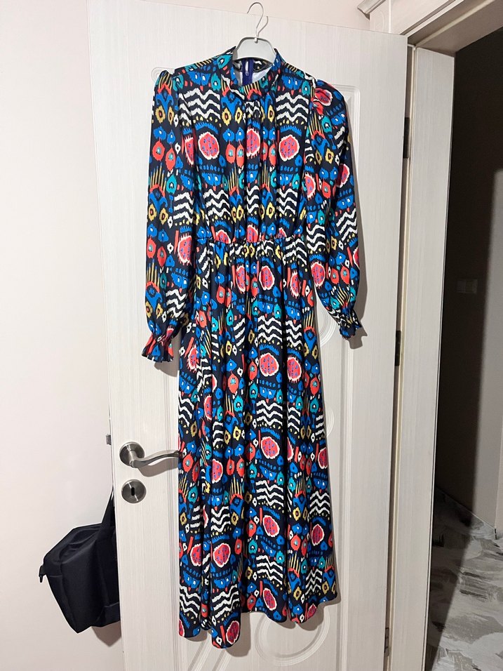 Renkli bohem elbise, yüksek yakalı, uzun kollu ve pilili detaylıdır. Salaş kesimi ve tie-dye deseni günlük kullanıma uygundur. Hiç kullanılmadı ürün sıfırdır