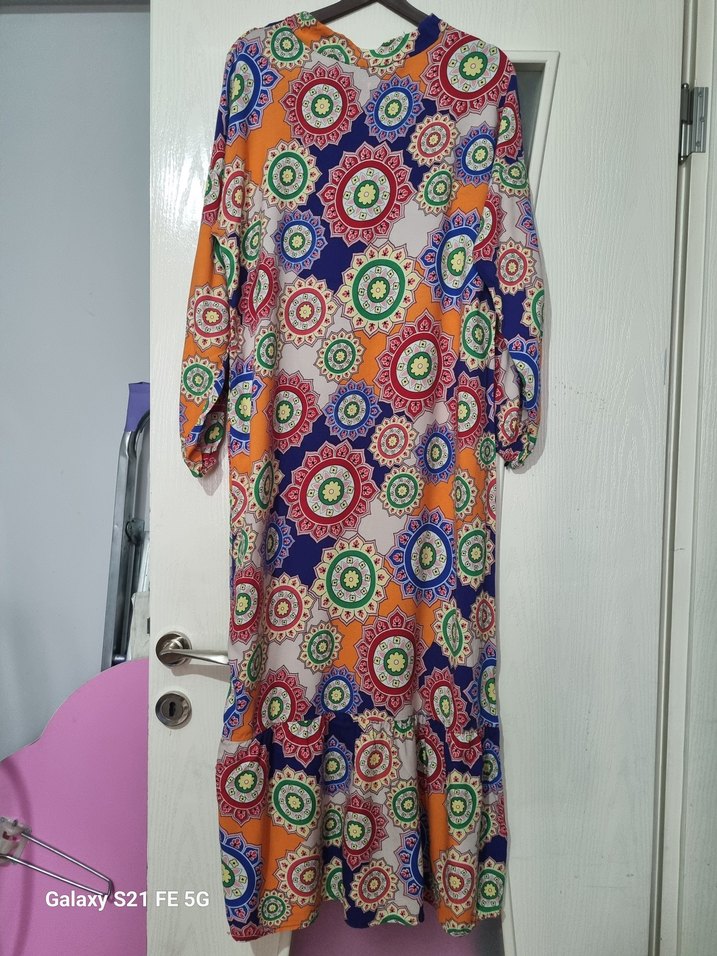 Renkli tie-dye desenli, uzun kollu, yuvarlak yakalı, bol kesim bohem uzun elbise, yumuşak sentetik kumaştan, fırfır detaylı. Sıfır ayarında. Sadece 2kez giydim.
