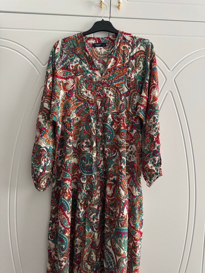 Renkli, bohem tarzda, uzun kollu ve V yakalı, bol kesim, hafif dokulu tekstil kumaştan, canlı paisley desenli ve drapeli uzun elbisedir.