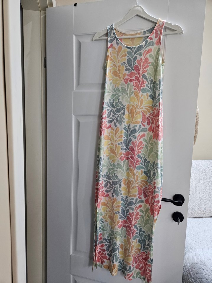 Uzun, kolsuz ve bol kesim bu elbise, pastel tonlarda batik desenli ve drapeli, bohem tarzı için uygundur.