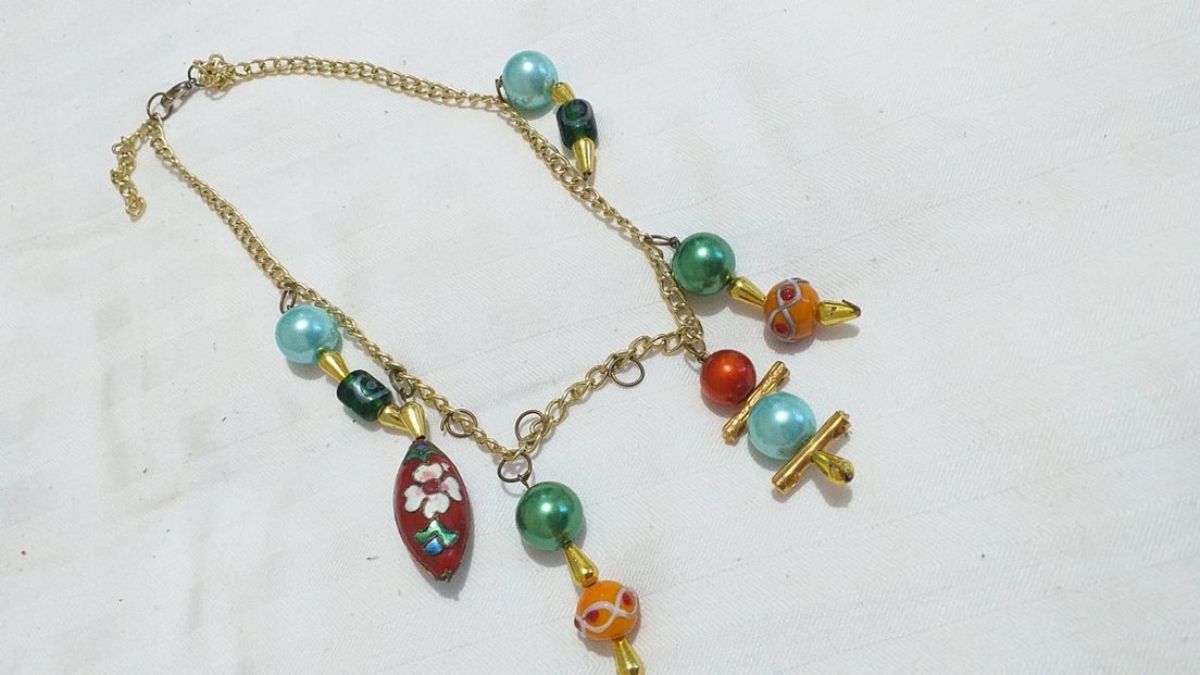 Detaylı zinciri ve renkli desenli boncuklarıyla uzun bohem tarzda günlük kullanıma uygun kolye.