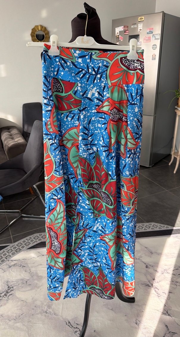 Sentetik kumaştan, bol kesim, renkli batik desenli ve drapeli uzun pantolon. Bohem tarz için uygun.
