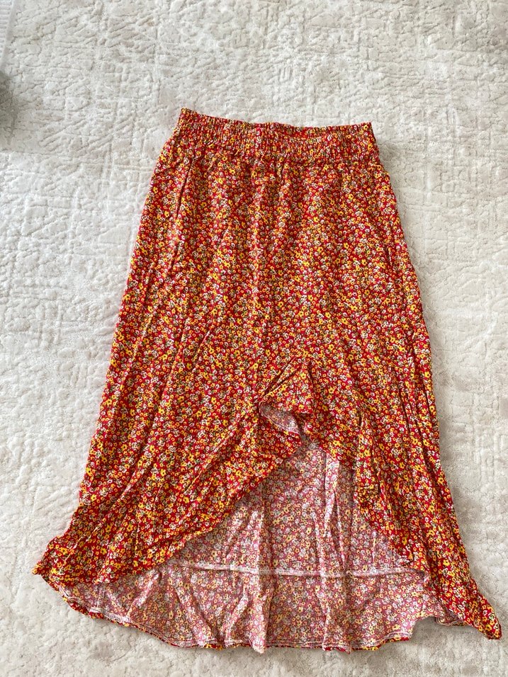 Renkli bohem uzun midi etek, bol kesim ve fırfır detaylara sahip. Yumuşak sentetik kumaştan yapılmış, canlı batik desenlidir.