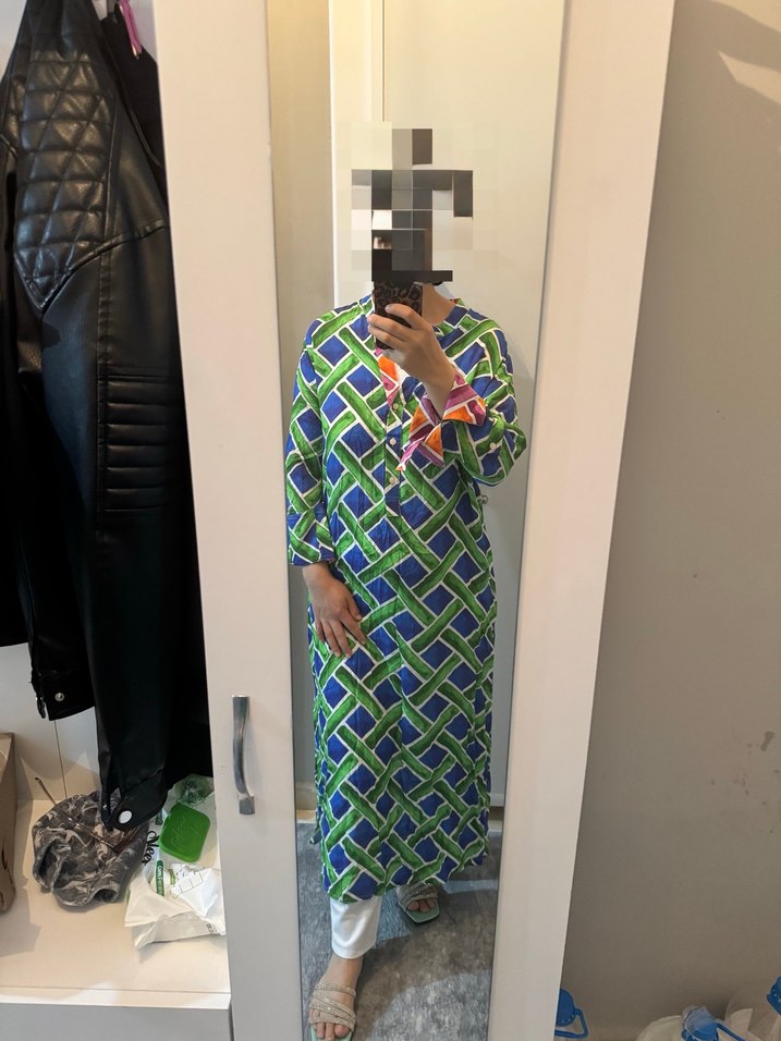 Renkli bağlama desenli, salaş kesim uzun elbise, V yaka ve dökümlü uzun kollara sahip bohem tarzda. Tesettürlüler için kullandığım gibi kullanılmaya uygundur