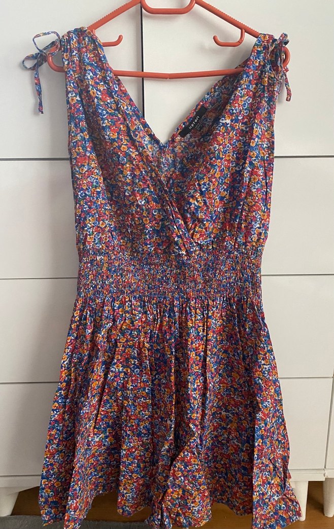 Renkli bohem tarzda, V yakalı ve askılı, dökümlü detaylı elbise. Rahat kesim ve midi boyda, yumuşak sentetik kumaştan, canlı batik desenli.