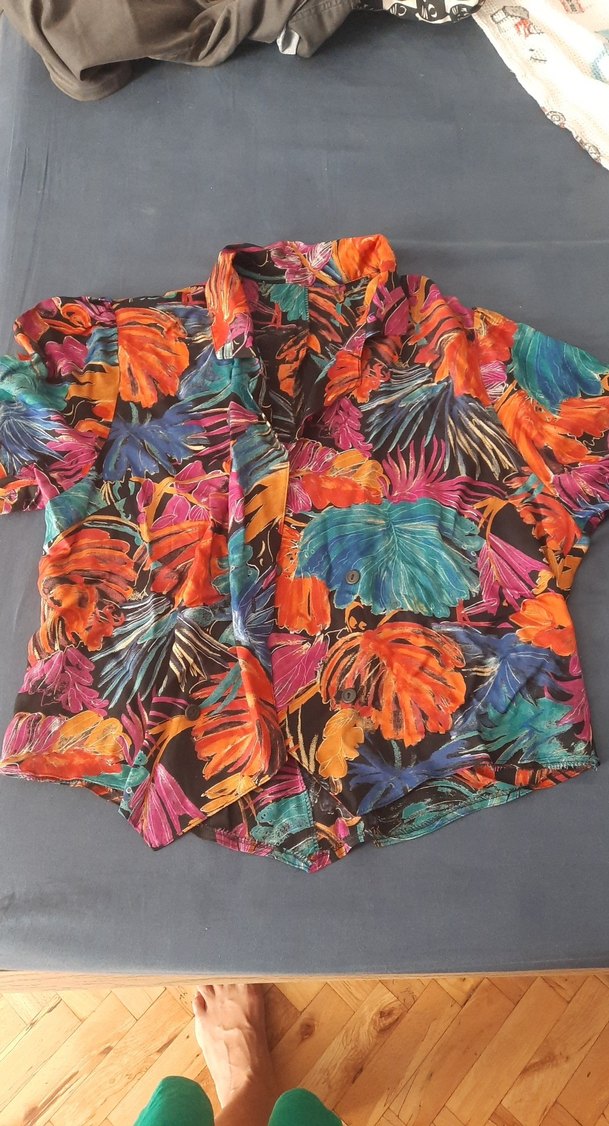 Renkli bohem tarzı gömlek, V yaka ve kısa kolludur. Düğmeli ön kısmı ve bol kesimi ile kısa uzunluktadır, yumuşak kumaştan üretilmiştir.
