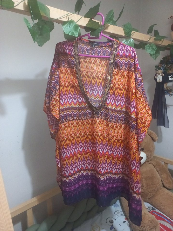 Renkli bohem tunik, dökümlü bol kesim, V yakalıdır. Batik desen, günlük kullanıma renkli ve retro bir hava katar. Plaj elbisesi . hic kullanilmadi