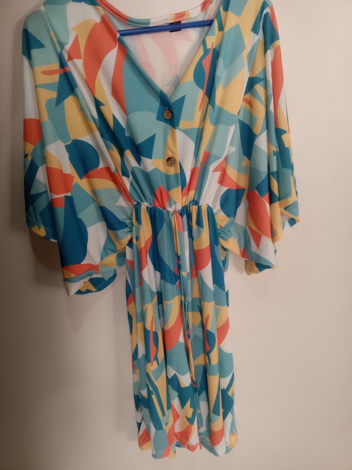 Pastel renklerde tie-dye desenli, V yakalı, düğmeli ve drapeli , bol kesim tulum. L XL beden