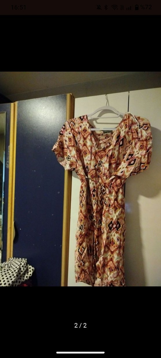 Renkli bohem tarzda, v yaka ve kısa kollu, bol kesim tunik. İpek gibi kumaştan, günlük kullanıma uygun.