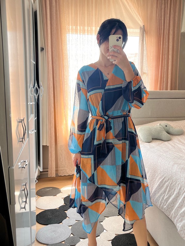 Renkli bohem uzun elbise, V yaka ve bol kesimlidir. Sentetik kumaştan, drapeli tasarımlı, askılı kollu ve belde bağcıklıdır. Günlük kullanıma uygundur.