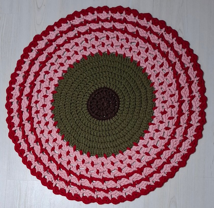Örgü dokulu, yeşil, pembe, kırmızı ve kahverengi tonlarında, renkli bohem tarzda yuvarlak halı. 90×90cm