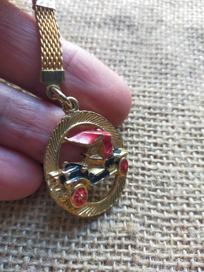 Bohem tarzda, detaylı altın rengi zincir ve renkli vintage araba figürlü anahtarlık. Klasik ve canlı unsurlar bir arada.