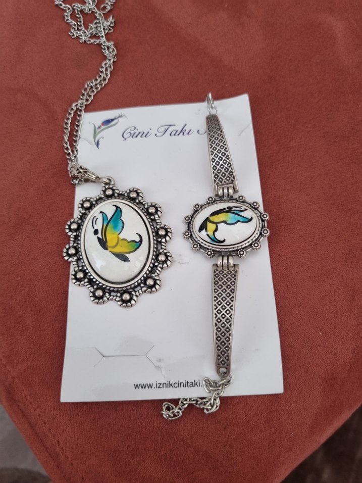 Renkli ve detaylı zincire sahip bohem kolye, vintage baskılı beyaz zeminli kelebek desenleriyle günlük kullanıma uygundur.