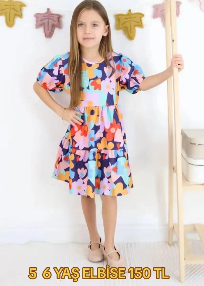 Renkli Bol Kesim Kız Çocuk Elbise