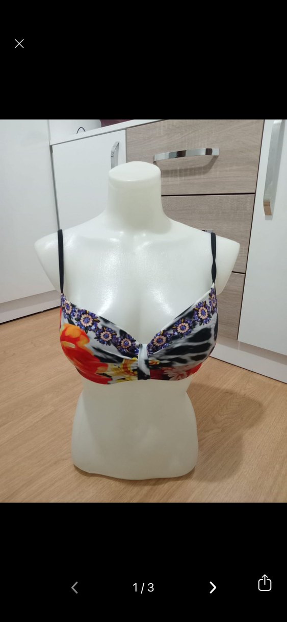 Renkli bohem desenli, boncuk detaylı ve askılı, kısa kesim, vücuda oturan bikini üstü.
