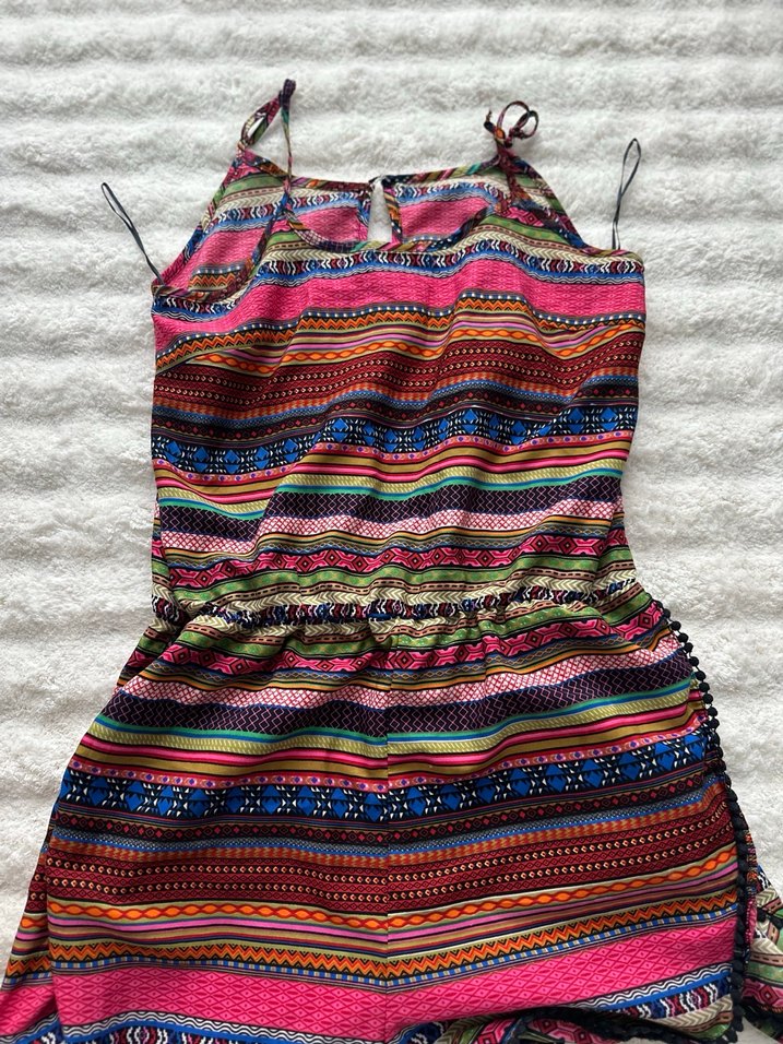 Renkli boncuk detayları ve bağcıklı askıları olan, bol kesim, kısa bohem tulum. Canlı batik desenleriyle günlük kullanıma uygun.