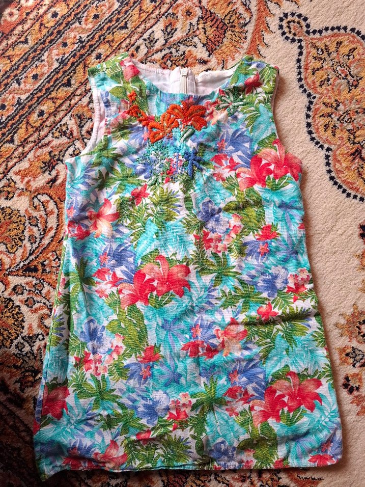 Renkli kolsuz kız elbisesi, bol kesim ve boncuk detaylarıyla süslenmiş, canlı tie-dye çiçek desenine sahip bohem tarzda.