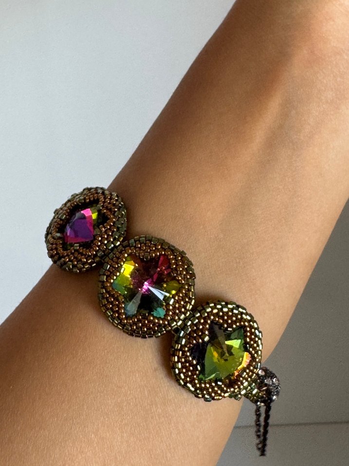 Annemin el emeği , sadece sizde olacak bir takı. Bu bohem bileklik, üç büyük çok renkli taş ve renkli boncuk işlemeleriyle romantik akşamlar için uygundur. ✨