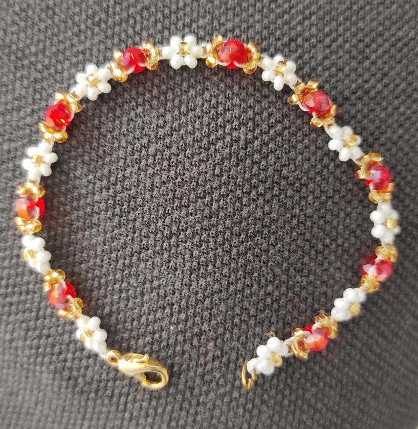 Bu renkli bohem bileklik, rahat ve retro tarzda işlenmiş boncuklara sahiptir. Düğünlerde kullanılmaya uygundur ve kırmızı-beyaz boncuklarla altın renkli tokaya sahiptir. Kendim yaptım. Bileğinizin ölçüsünü verirseniz bileğinize uygun yapabilirim.