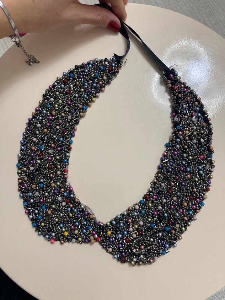 Kadın kolyesi, günlük kullanıma uygun, gotik tarzda, koyu renkli çok renkli boncuklarla işlenmiş midi uzunluktadır.