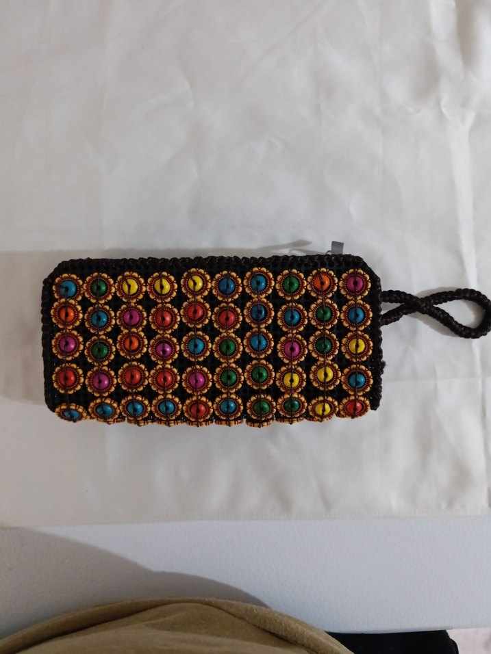 Renkli boncuk işlemeleri ve örgü dokusuyla bohem tarzda, gençlere uygun günlük kullanıma uygun kadın cüzdanı.