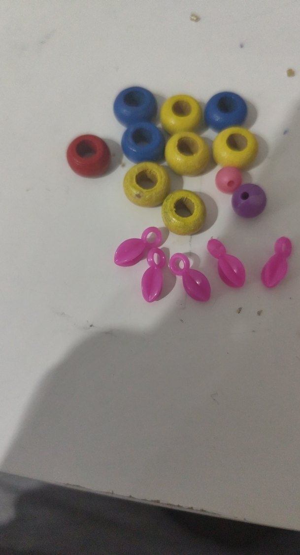 Mavi, sarı, kırmızı, pembe ve mor renklerde çeşitli boncuklardan oluşan renkli bir set.