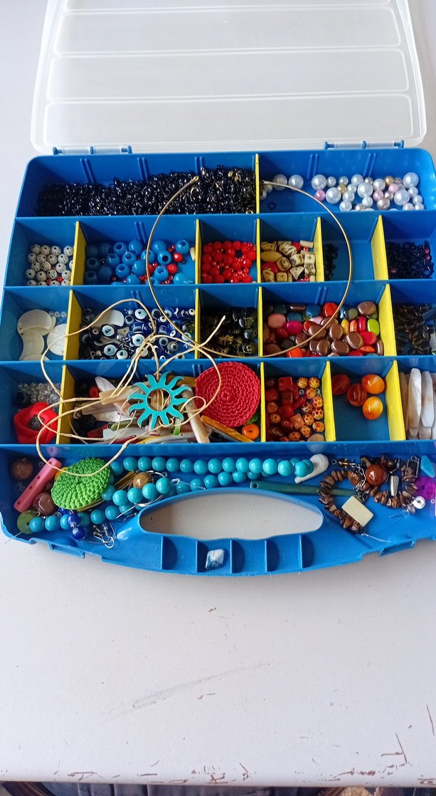 Mavi plastik kutuda düzenlenmiş çeşitli renkli boncuklar ve hobi malzemeleri seti, takı yapımı için uygundur. Kutusu ile birlikte gönderilecektir