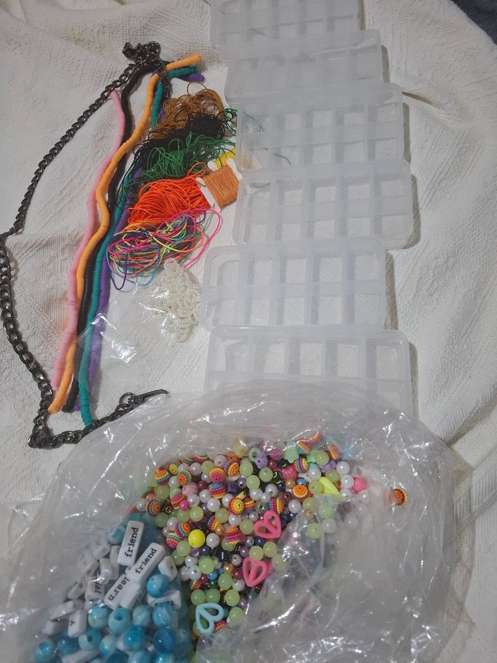 Çeşitli renk ve şekillerde boncuklar ile iplerden oluşan, şeffaf plastik kutularda saklanan renkli hobi seti. 6 tane 10 gözlü takı kutusu 5 paraşüt ip iki mum ip 5 tane fimo ve çelik zincirle beraber
