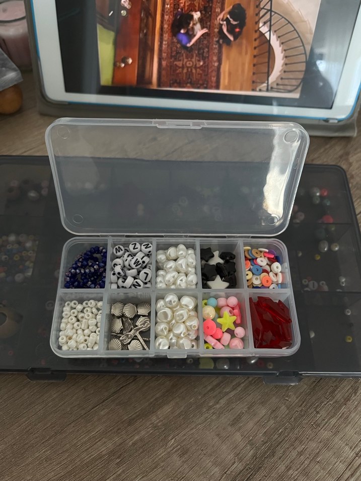 Şeffaf bölmeli kutuda çeşitli renk ve şekillerde boncuk ve takı malzemeleri seti.