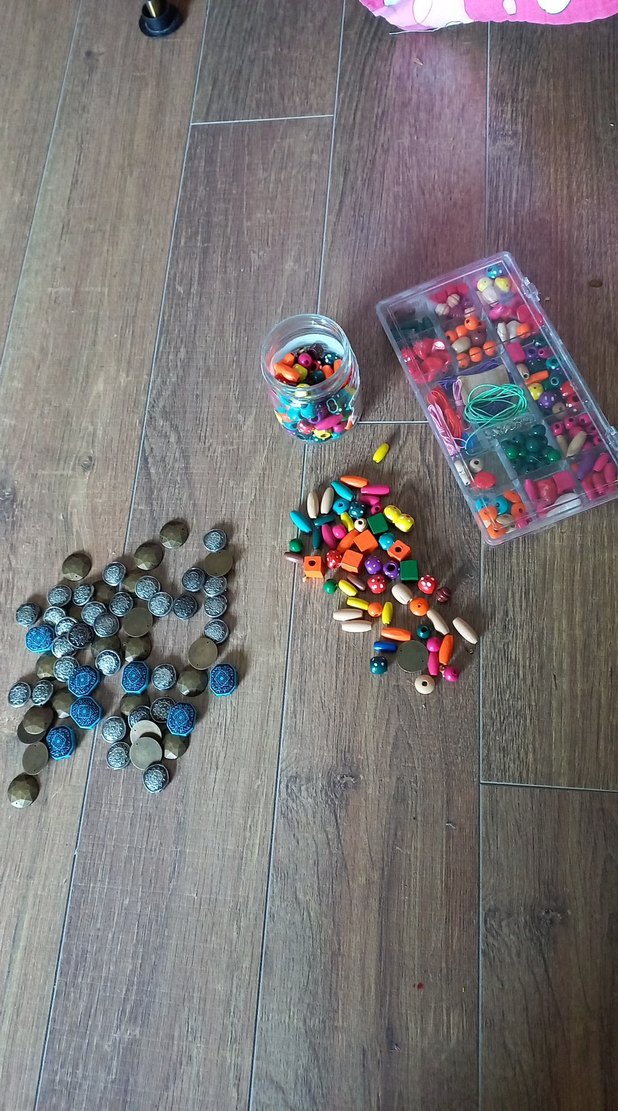 Çeşitli şekil ve boyutlarda renkli boncuklar ile takı malzemeleri seti, şeffaf kutu ve küçük kapta yer almaktadır.