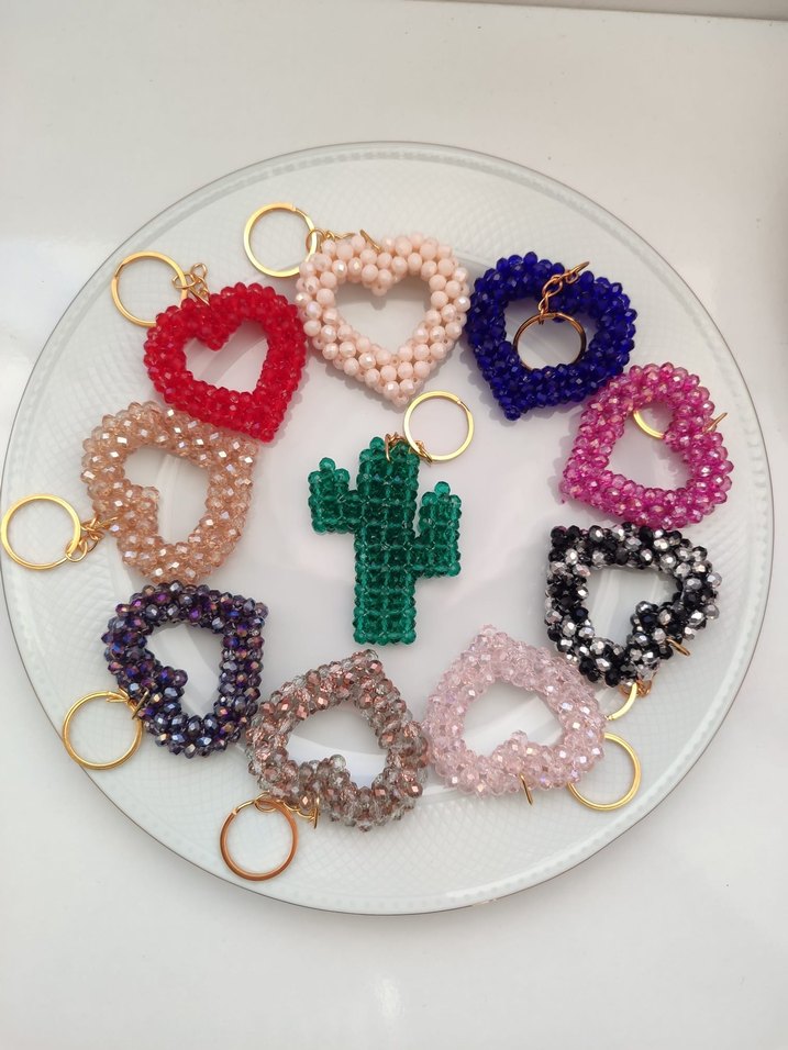 Kalp ve kaktüs figürlü, renkli boncuklarla süslenmiş bohem tarzı anahtarlık