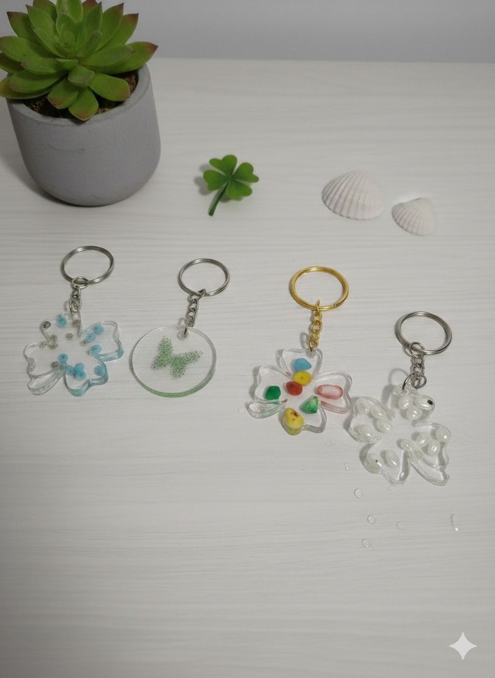 Kelebek ve çiçek figürlü, beyaz ve şeffaf tabanlı renkli boncuklu bohem tarzı anahtarlıklar. 10 lu sipariş alınır