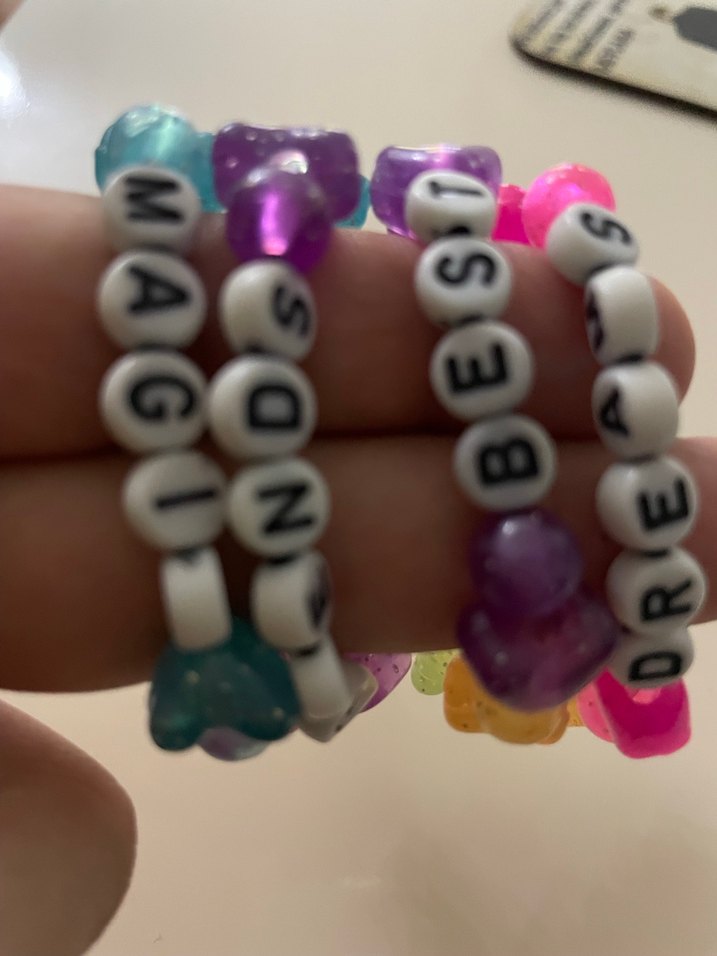 Renkli boncuklar ve harfli baskılı boncuklarla süslenmiş bebek, kız çocuk bileklikleri. Bohem tarzda, parti için uygun aksesuarlar. ✨