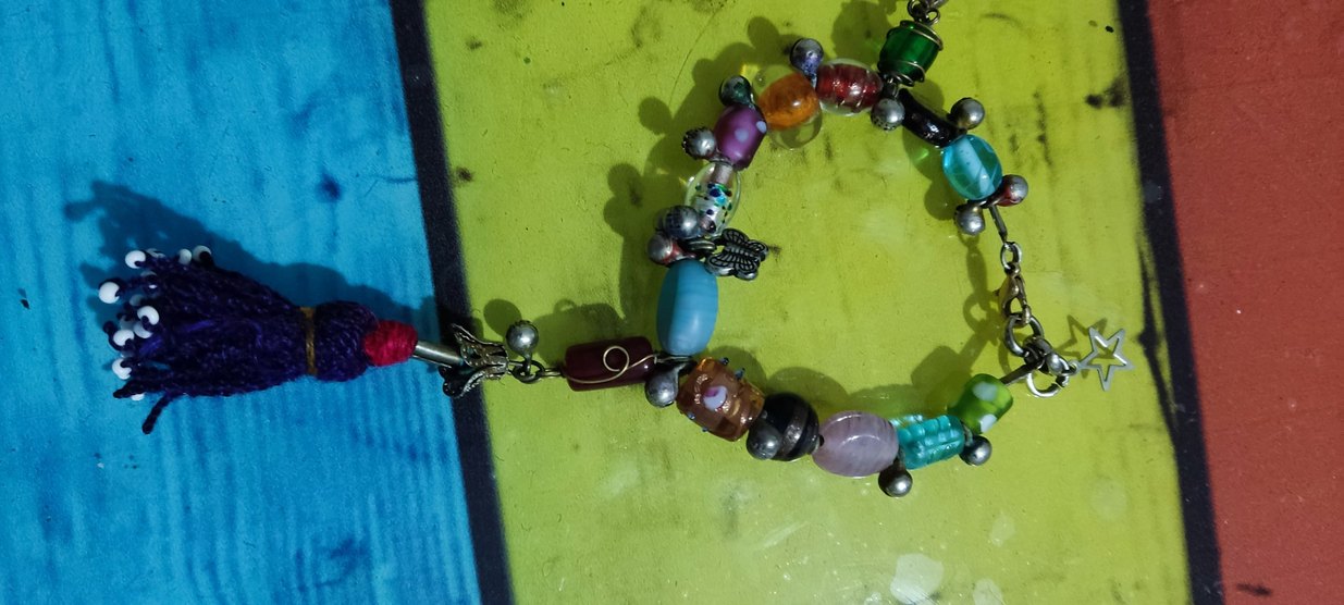 Renkli ve desenli boncuklardan oluşan, küçük bir figür detaylı bohem tarzda Bayan bilekliği.