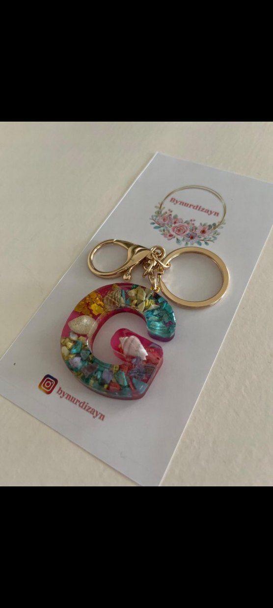 Altın renkli halka ve kancaya sahip, boncuklu ve çok renkli 'G' harfi şeklinde reçine bohem anahtarlık.