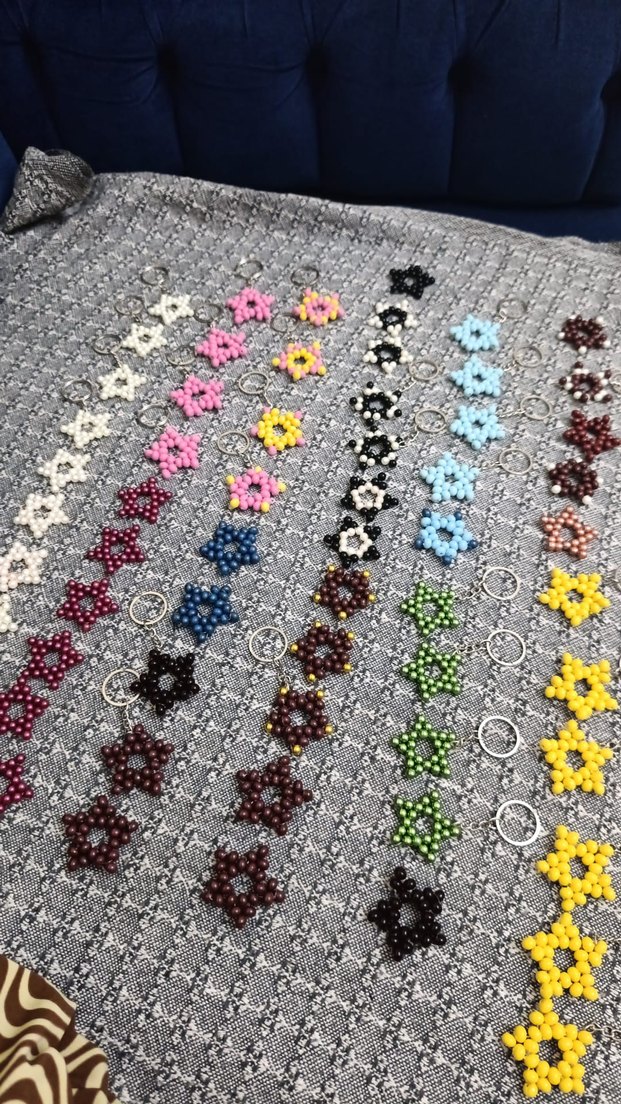 Çeşitli renklerde ve çiçek desenlerinde, bohem tarzında renkli boncuklu anahtarlıklar, dokulu bir kumaş üzerinde düzenli şekilde sıralanmış.