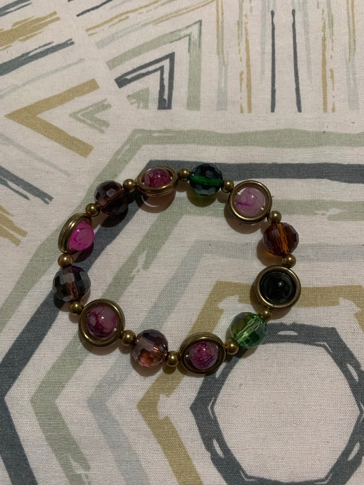 Bu bileklik, günlük kullanım için uygun çok renkli boncuklarla vintage bohem tarzında tasarlanmıştır. Tie-dye desenli zemin ve 7 numaralı boncuk bulunmaktadır.