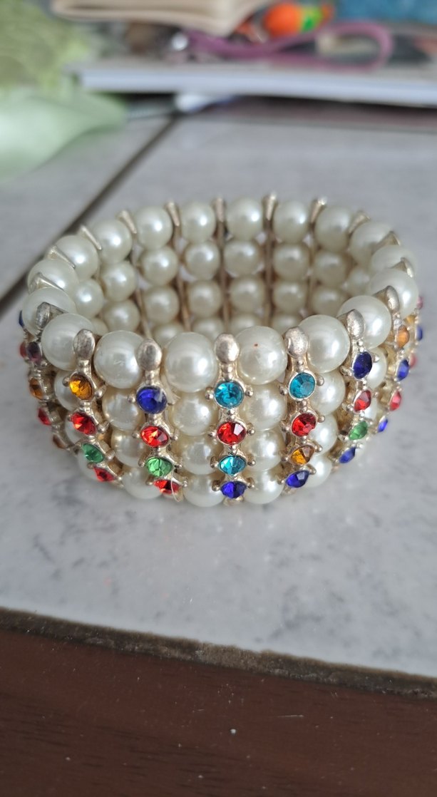 Gösterişli ve vintage tarzda çok sıralı bileklik. İnci görünümlü boncuklar ve renkli taş detaylarıyla oldukça şık ve dikkat çekici bir modeldir. Esnek yapısı sayesinde kolay takılıp çıkarılır, bilekte dolgun ve zarif durur. Günlük kullanıma olduğu kadar özel davet ve kombinler için de uygundur. Temiz ve sağlam durumdadır, kırık veya kopuk yoktur. • Vintage / retro stil • İnci görünümlü boncuk • Renkli taş detaylı • Esnek yapı • Bileklik formu