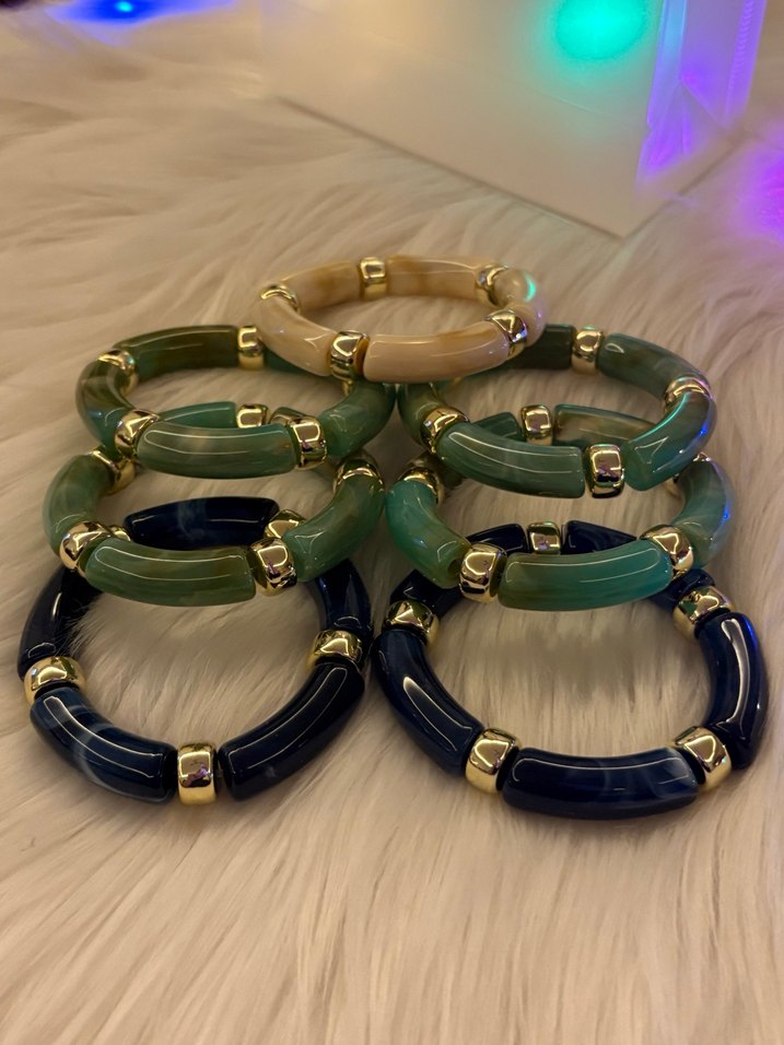 Bohem tarzda, koyu renkli tie-dye desenli çok renkli boncuklarla ve altın detaylarla süslenmiş bileklikler. Günlük kullanıma uygundur.