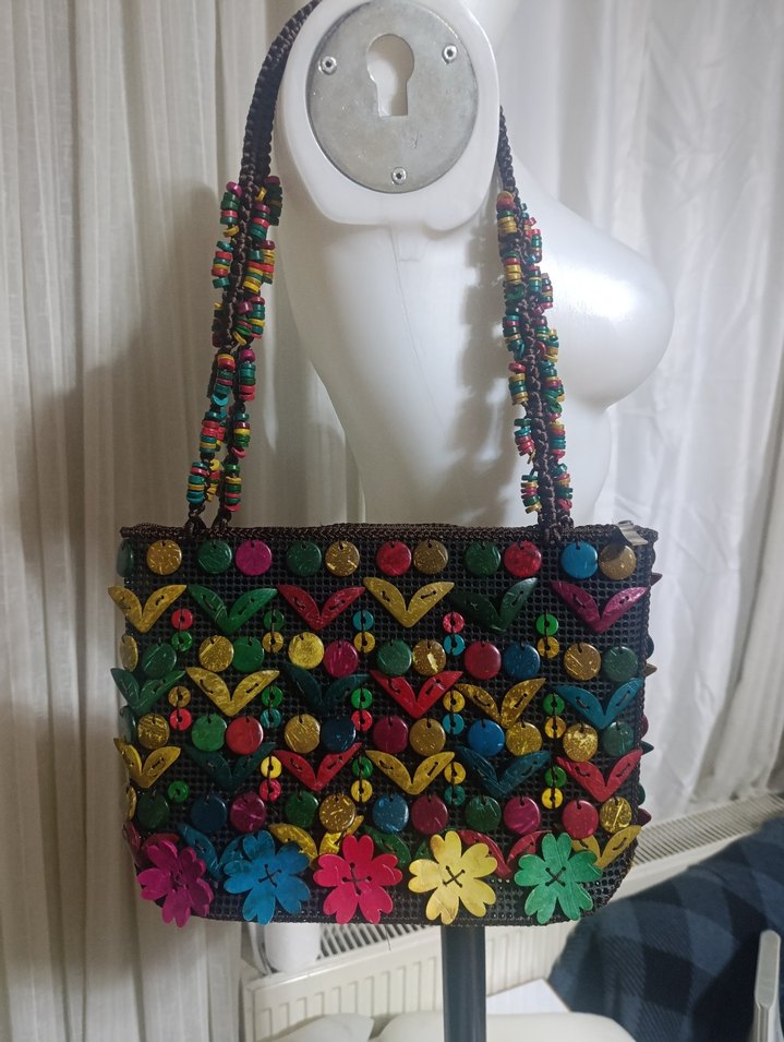 Renkli boncuklar ve çiçek desenleriyle süslenmiş, plastik malzemeden yapılmış bohem tarzda kadın çantası. Günlük kullanıma uygun, canlı ve retro bir model.