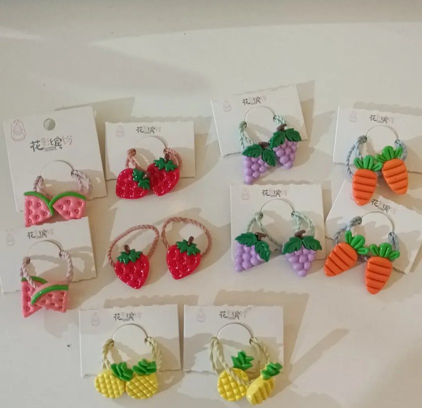 Çilek, üzüm, ananas ve havuç figürlü renkli boncuklu bohem tarzda çocuk saç tokaları ve bantları.