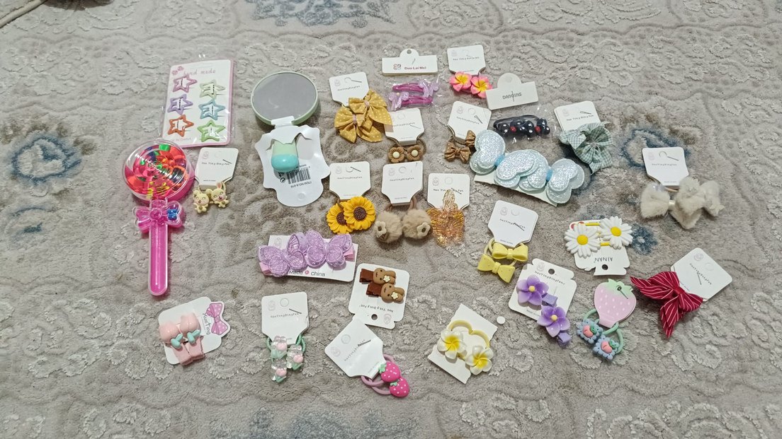 Renkli ve boncuklu detaylara sahip bohem tarzda çocuk saç tokaları ve bantları. Çiçek, fiyonk ve çilek figürleri içerir.
