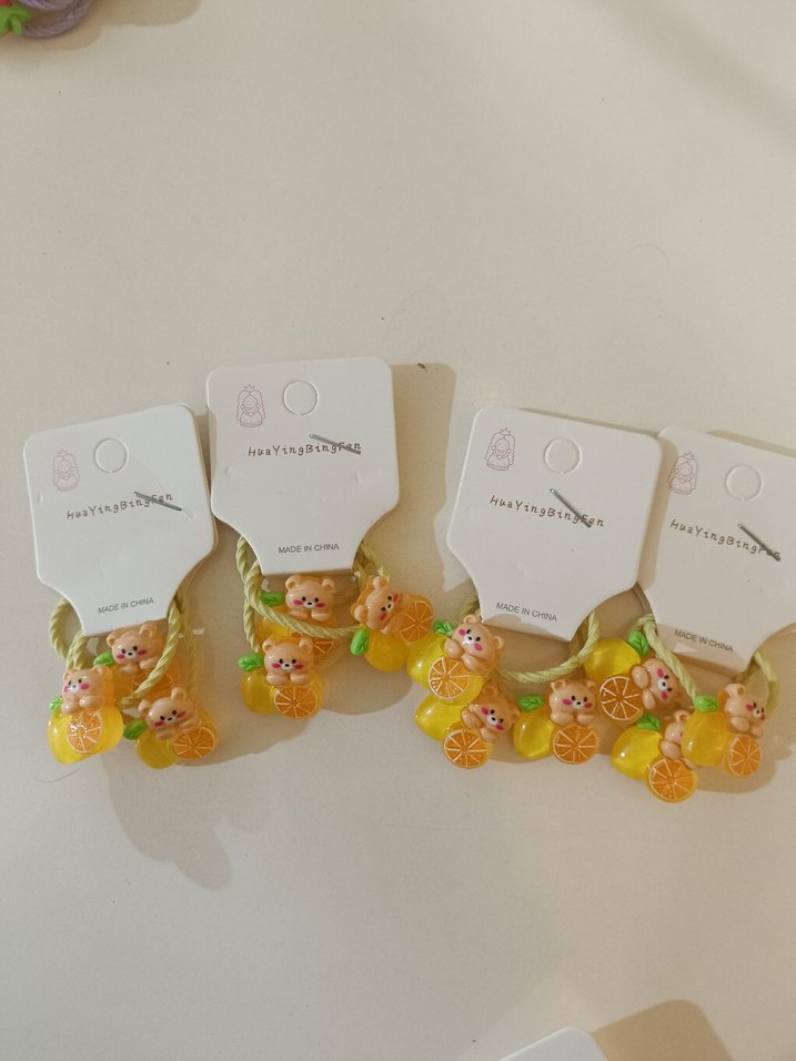 Sarı boncuk ve baskılı desenlerle süslenmiş renkli, bohem tarzda çocuk saç tokaları. Retro ve hippie görünüm için uygundur.