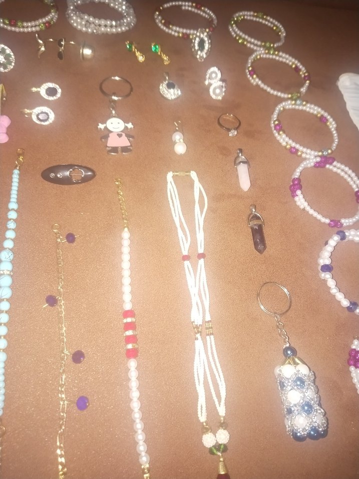 Çocuklar için çok renkli, boncuklu ve bohem tarzda bileklik, yüzük ve anahtarlık seti.
