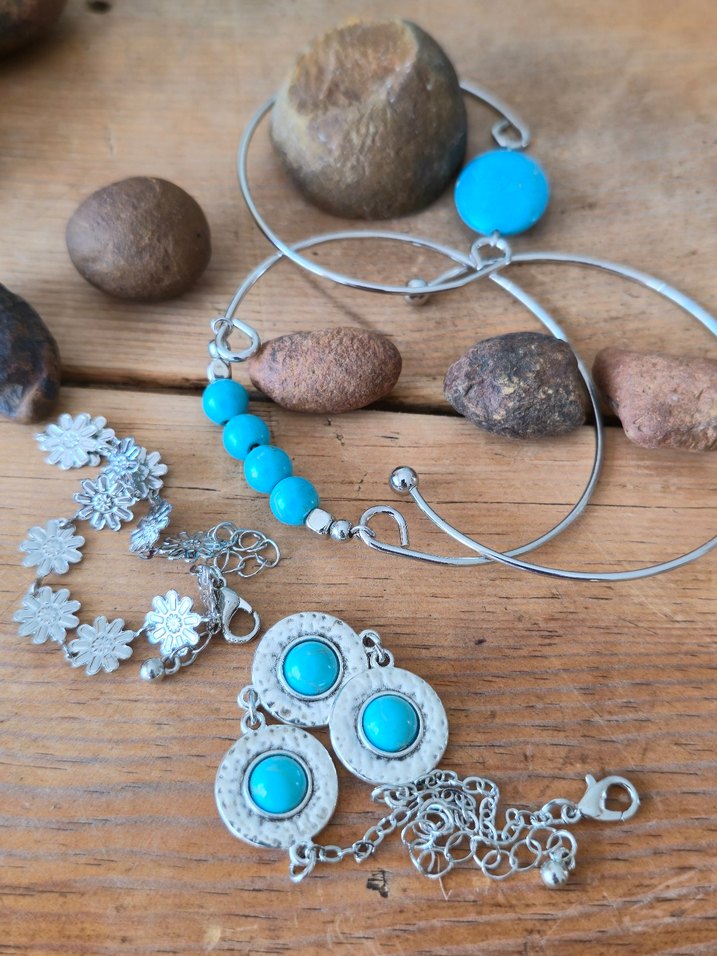 Turkuaz boncuklar ve etnik desenler içeren renkli bohem çocuk takı seti, bileklik ve kolye ile birlikte.