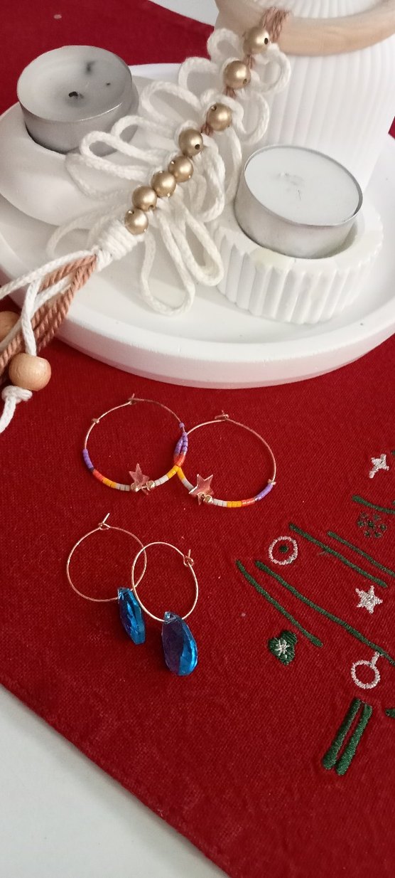 Renkli boncuklarla süslenmiş, bohem ve retro tarzda halka küpeler. Parti için uygun, normal uzunlukta ve minimalist tasarımda.