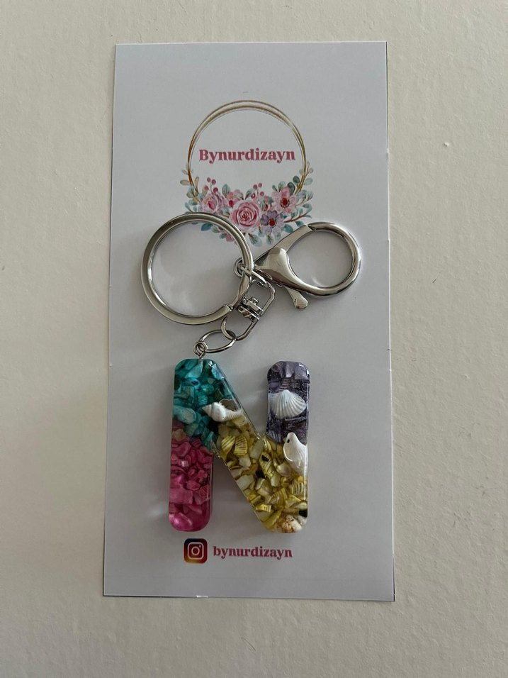 Renkli boncuklu ve küçük deniz kabukları detaylı 'N' harfi şeklinde bohem tarzda kadın anahtarlık. Metal halka ve klips ile birlikte gelir.
